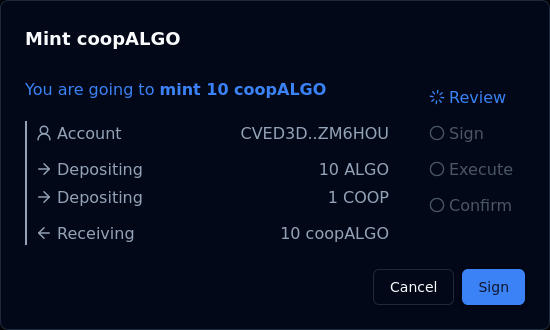 E.g. If coopALGO is at 10:1 with COOP, the user would deposit 10 ALGO + 1 COOP to receive 10 coopALGO tokens.